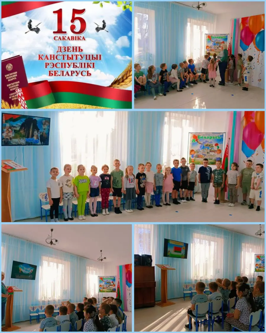 В нашем детском саду прошла игра-путешествие по страницам Конституции Республики Беларусь "Я знаю законы своей страны" для воспитанников старшей группы, посвященные этому празднику. Воспитанники познакомились с понятием «закон», «порядок», «право», повторили государственную символику: флаг, герб, гимн. Закрепили и уточнили представления о правах и обязанностях граждан.